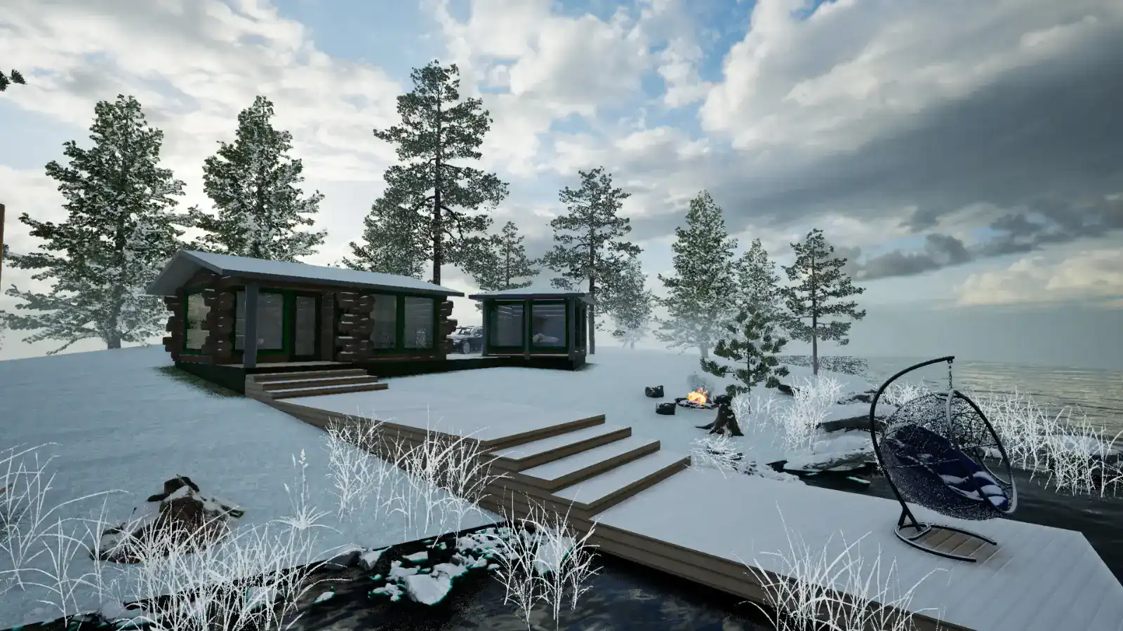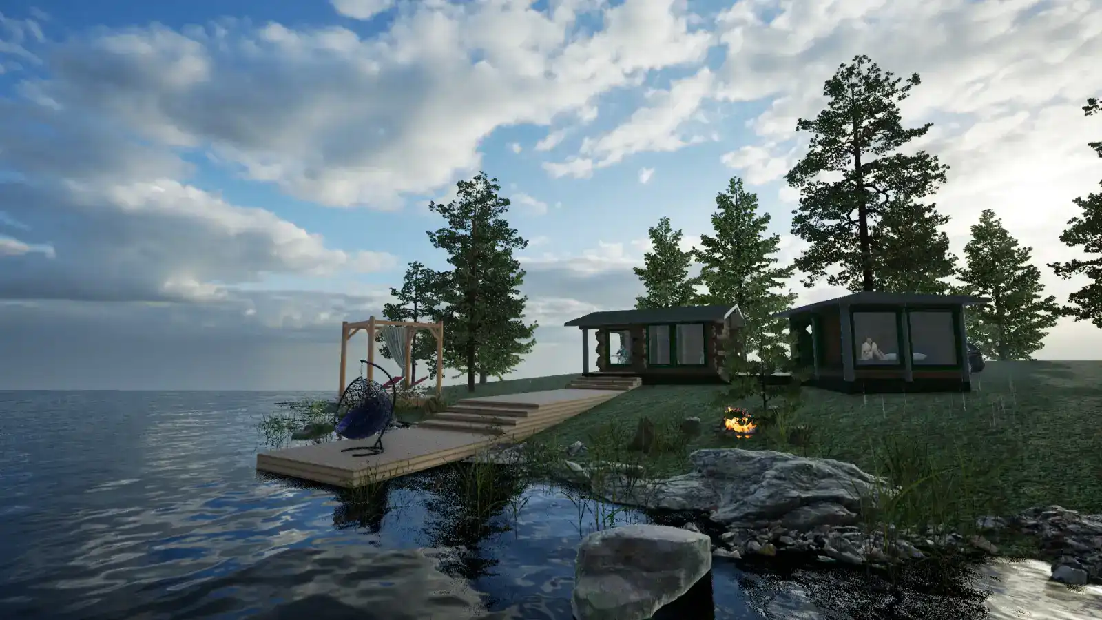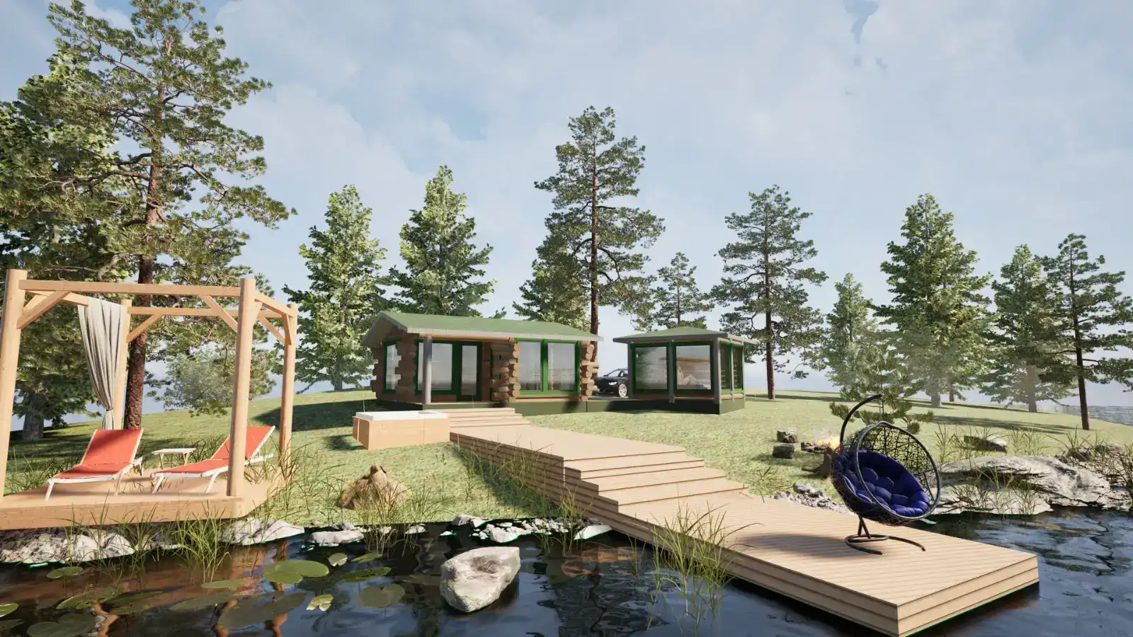 בניה של בקתות יוקרה על שפת אגם, עם חיבור מלא לטבע.